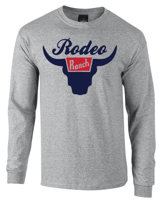 Login to view price.The Banquet Long Sleeve Shirt by Rodeo Ranch features a unisex fit body in sport grey with navy and red screen-printed art.