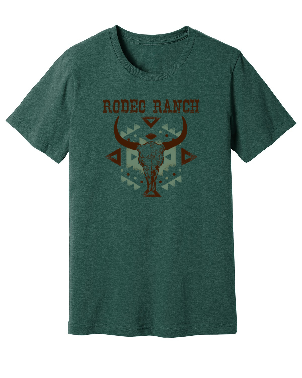 Login to view price.The Retro Aztec Skull Short Sleeve Shirt by Rodeo Ranch features a unisex fit body in heather forest with full color art.